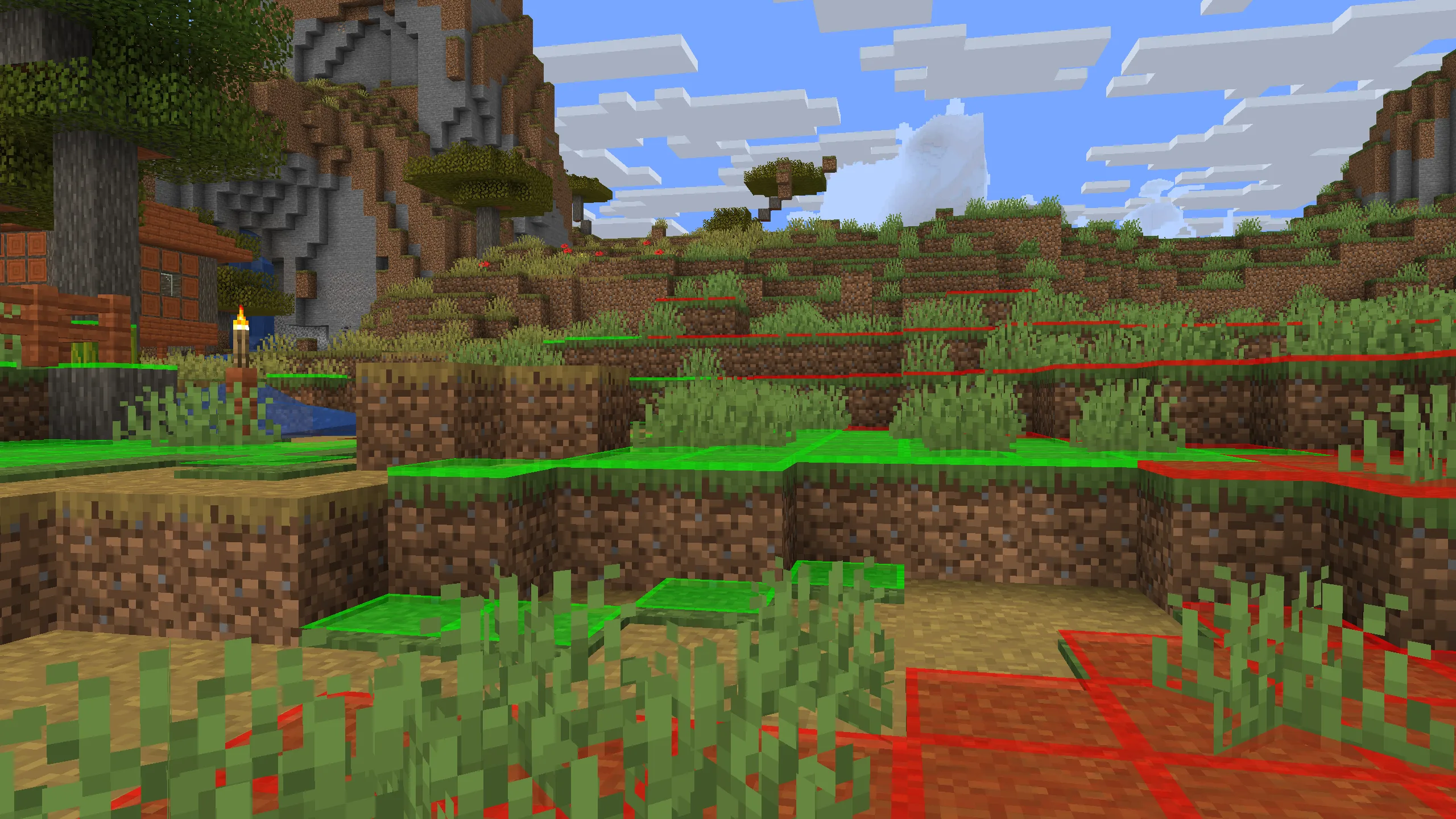 Сравнение уровней освещенности в Minecraft с использованием мода Light Overlay.