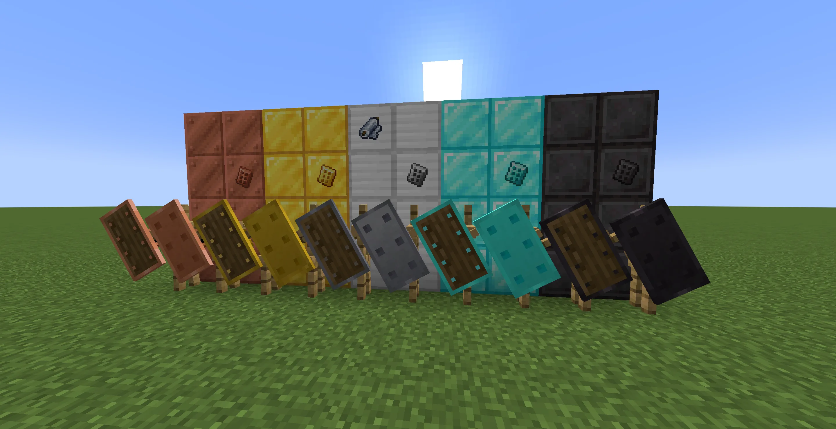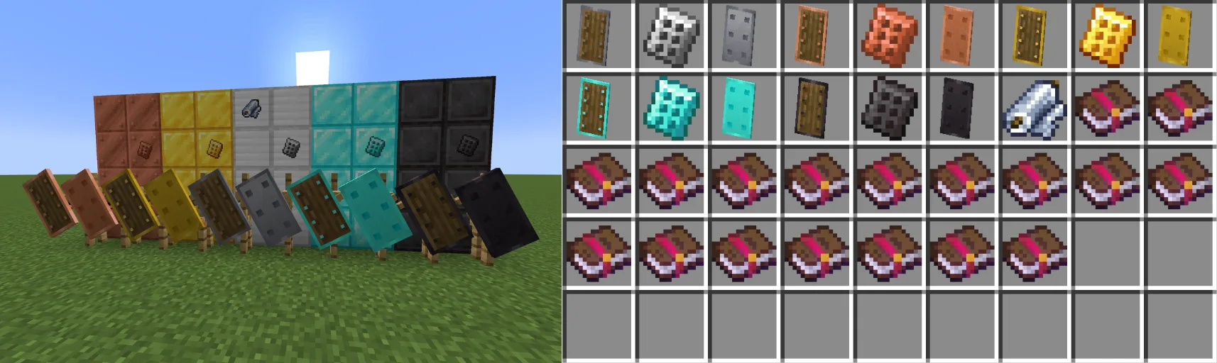 В игру добавляется линейка щитов, которые логично дополняют стандартную систему брони. Каждый новый предмет соответствует материалам ванильных доспехов, от железа до нетерита, и обладает своими характеристиками прочности или поглощения урона. Механика апгрейдов позволяет усиливать защиту с помощью специальных пластин, устанавливаемых прямо на верстаке. Расширенная поддержка чар дает возможность гибко настраивать снаряжение под конкретные задачи, превращая обычный щит в инструмент для выживания в самых жестких условиях.