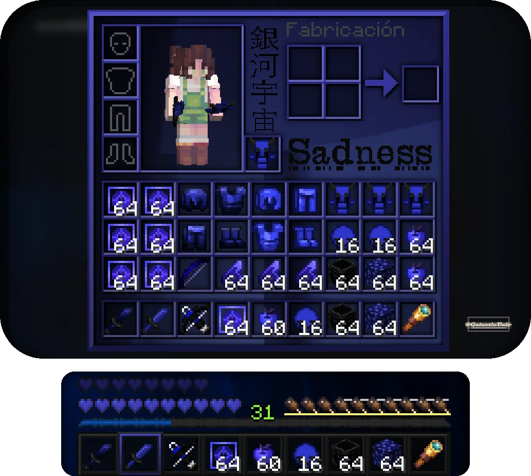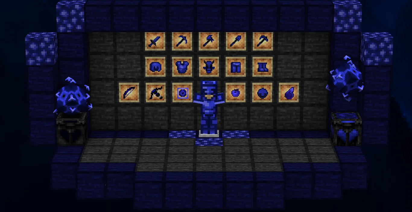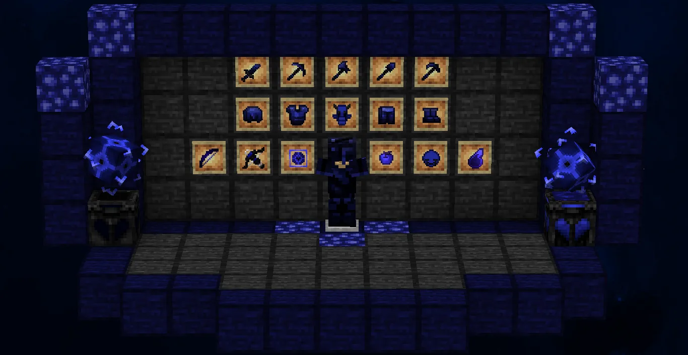 Этот пак делает акцент на контрастной цветовой гамме, где глубокие синие оттенки заменяют стандартные текстуры предметов. Мечи получили укороченные лезвия для лучшего обзора в пылу сражения, а броня приобрела характерный неоновый блеск, который выделяет игрока на фоне ландшафта. Прозрачный интерфейс инвентаря и минималистичный прицел позволяют быстрее считывать информацию о запасах ресурсов. Частицы при ударах и критических атаках переработаны в яркие искры, что помогает лучше контролировать дистанцию и тайминги в PvP. Небо окрашено в темные тона с четкими границами, убирающими лишний визуальный шум во время активного боя. Все блоки с важными игровыми объектами, вроде руд или сундуков, получили выделяющиеся контуры, позволяющие мгновенно замечать цель в движении.