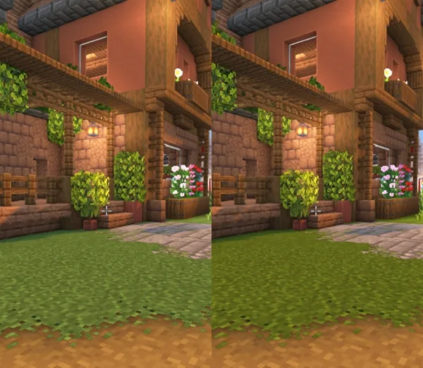 Текстуры травы в этом пакете переработаны под естественную палитру, где акцент смещен с ядовито-зеленого на приглушенные травянистые и оливковые оттенки. Переход между биомами выглядит плавным, без резких скачков цвета, что визуально объединяет ландшафт в единое целое. Нижняя часть блоков земли теперь имеет мягкий градиент, имитирующий реальную почву, а края травы слегка «заходят» на боковые грани. Такая детализация убирает эффект плоских зеленых коробок, добавляя глубины даже на ровных участках местности.